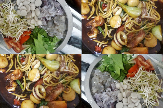 ▶️ Seterusnya, masukkan Sos cili, sos tiram,sos ikan,kicap pekat,kicap manis ,kicap mee, dan masukkan sotong dan fish ball dan masukkan air putih 1cawan kecil.