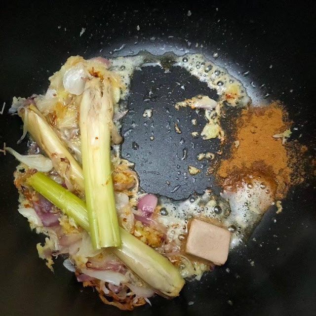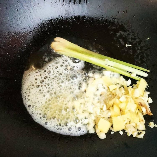 ▶️ Seterusnya, masukkan halia, bawang putih dan serai tumis sehingga naik baud an keperangan.