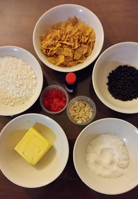 banyak bahan yang dicampur untuk dijadikan biskut red pearl ni seperti almond strips, cornflakes, ceri merah dan coklat cip. Tapi campuran bahan-bahan ini lah yang membuat biskut red pearl ini sedap.
