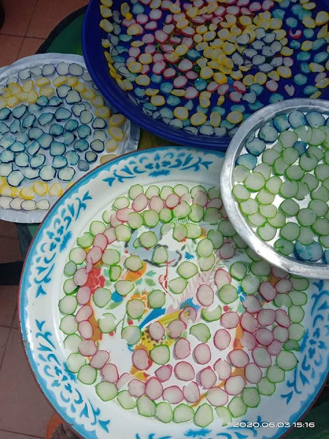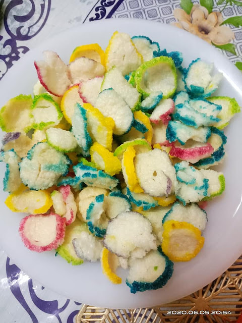 Nampak warna-warnikan keropok nasi bawang putih ni, dah macam keropok moni. Dah kering bolehlah goreng untuk santapan anak-anak. Selebihnya boleh disimpan, bila nak makan baru goreng.