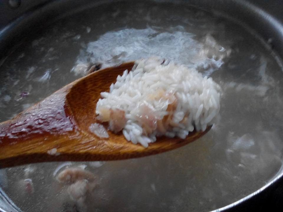 ▶️ Selepas itu, masukkan bahan yang ditumis tadi ke dalam air rebus ayam, masak sampai jadi bubur.