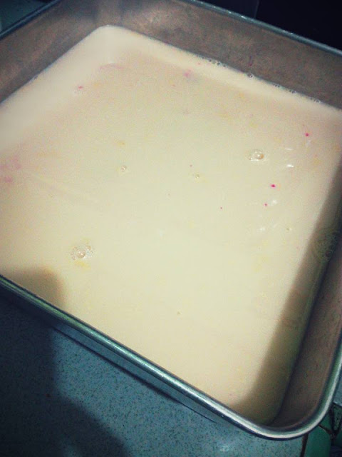 ▶️ Akhir sekali, tuang agar-agar susu dalam loyang yang ada potongan buah tadi (kalau agar-agar yang ada buah tu dah keras, kais-kaiskan sikit guna garfu baru tuang agar-agar susu tadi.