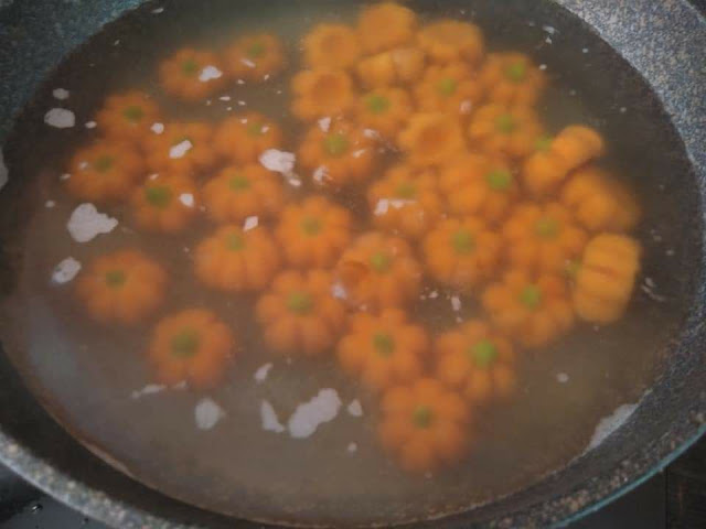 ▶️ Dalam periuk, didihkn air dan masukkan bebola labu. Bila ia dah timbul, angkat dan toskan. Masukkan ke dalam air sejuk supaya ia tak melekat antara satu sama lain.