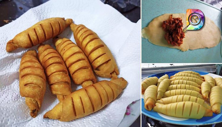 ▶️ Pada bahagian yang tirus canai nipis sedikit dan belah-belahkanya. Bila menggulung tidak perlu meletakkan air untuk melekatkan doh.