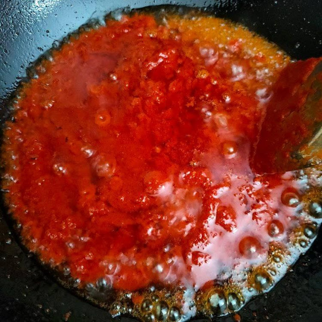 ▶️ Kemudan, masukkan garam,gula, dan serbuk perasa, gaulkan rata dan masak sehingga warna merah gelap.
