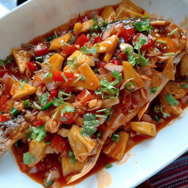 ▶️ akhir sekali masukkan bawang besar, nenas, cili api dan serai kacau beberapa minit baru tutup api. Boleh curahkan kuah keatas ikan yang digoreng tadi.