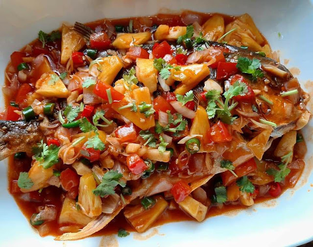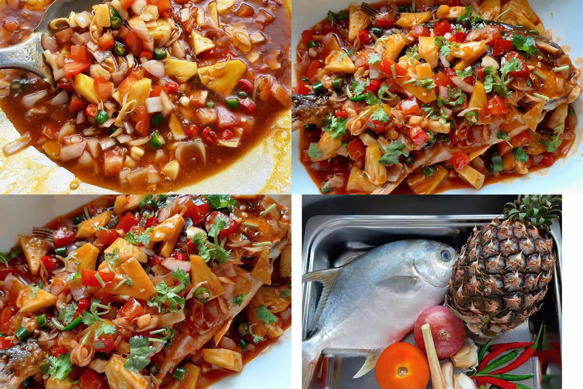 Ikan bawal memang sedap kalau digoreng, tambah pulak goreng garing-garing lagi sedap. Ikan kalau segar, isinya akan rasa manis makan macam tu sahaja pun dah sedap. Untuk masak hidangan ini, ikan bawal kena goreng terlebih dahulu baru akan curahkan sos diatasnya.