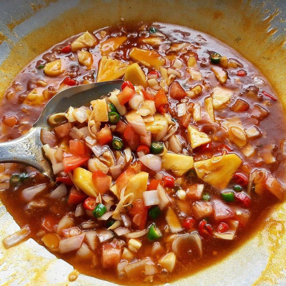 Kalau masak tiga rasa ni tak ada nenas memang tak berapa jadi lah masak tiga rasa tu, sebab kena ada rasa masam, manis, dan pedas pada hidangan ini. Sebab itu kunci kesedapan rasanya ada pada nenas.