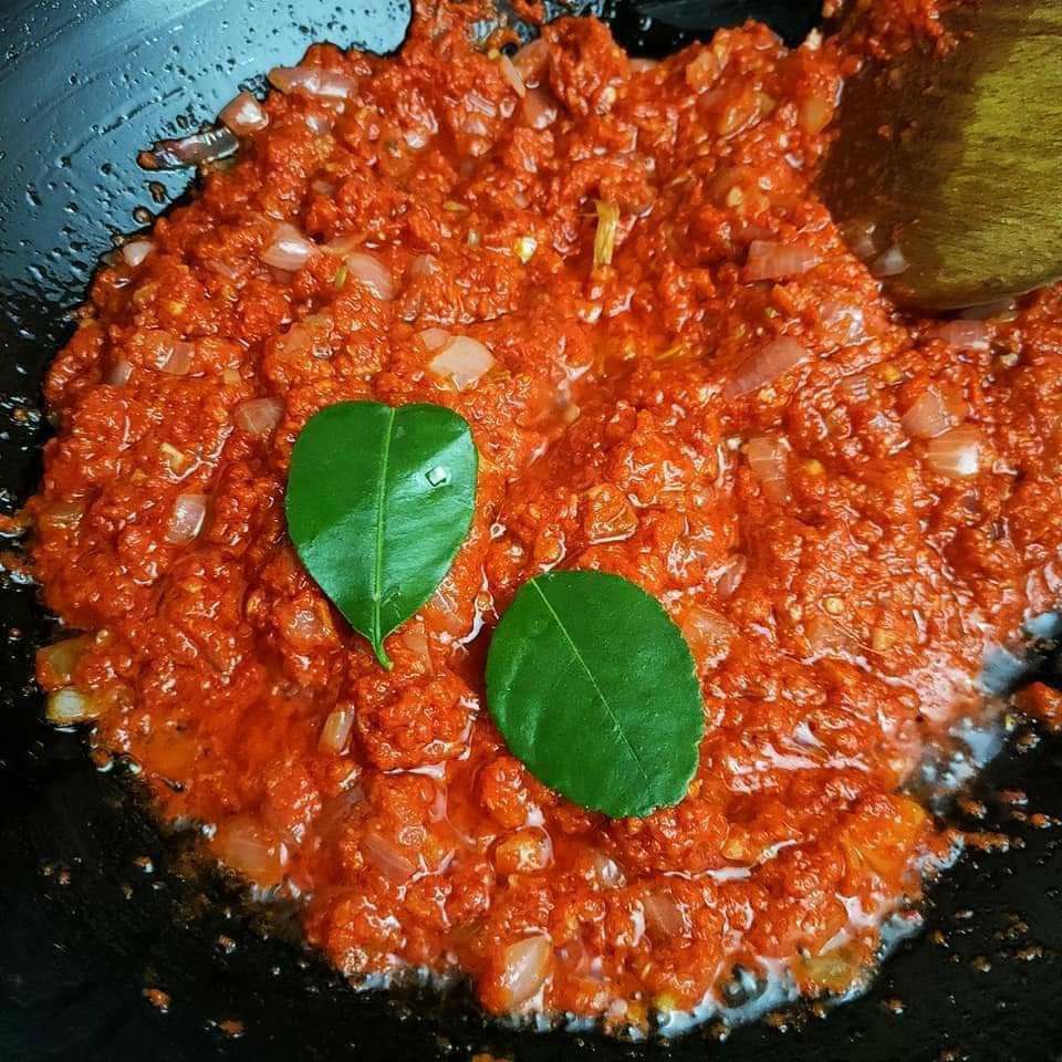 ▶️ Kemudian, masukkan cili kisar, daun limau purut dan tumis sehingga pecah minyak,