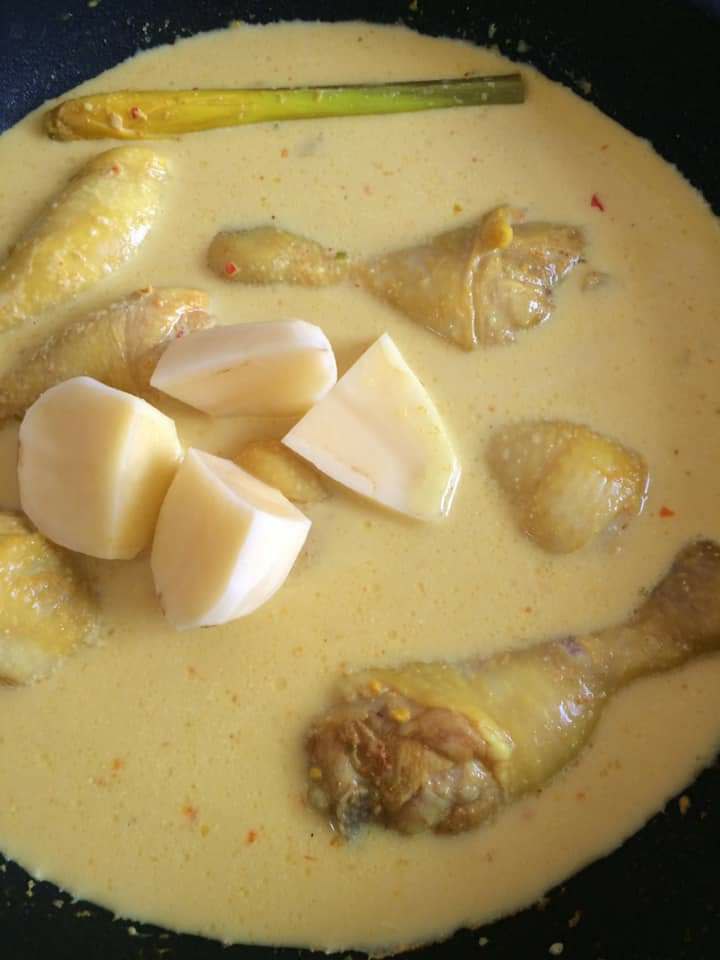 ▶️ Kemudian, masukkan ubi kentang yang dah dipotong empat dan masak sehingga empuk.