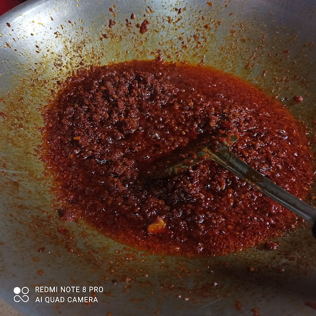 ▶️ Apabila sambal sudah pecah minyak, masukkan 4 sudu gula untuk karemelkan sambal.