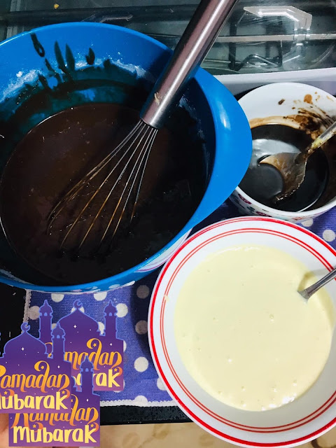 ▶️ Masukkan adunan choc dahulu dan seterusnya masukkan adunan cream cheese secara bertompok.